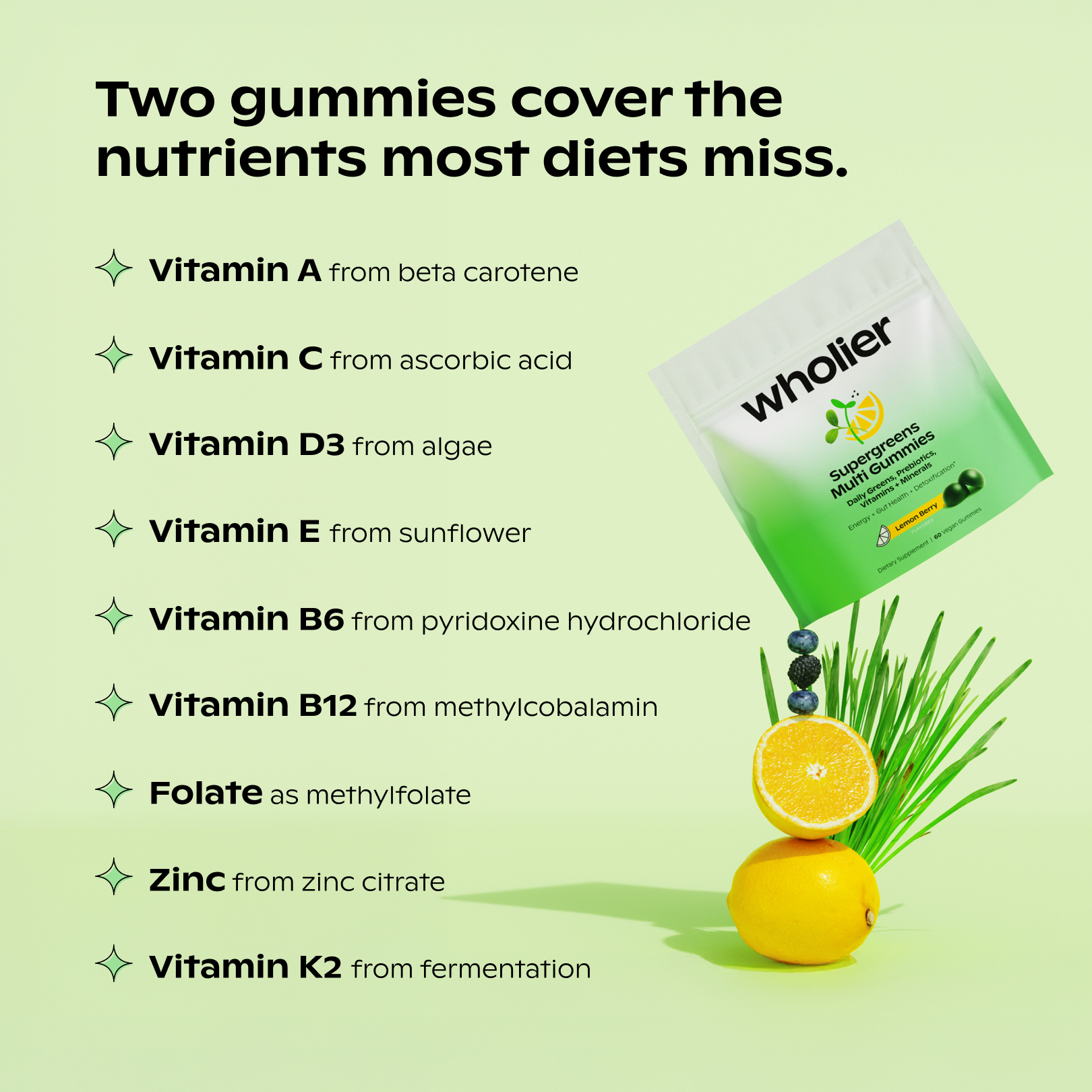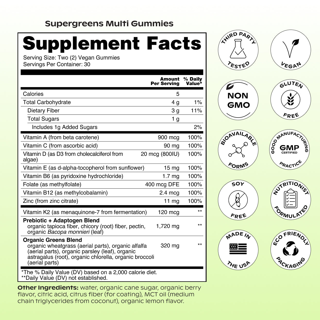 The Supergreens Multi Gummies includes essential vitamins, minerals, organic greens, and prebiotics to help fill common nutrient gaps. For many people, it offers broad daily support on its own.