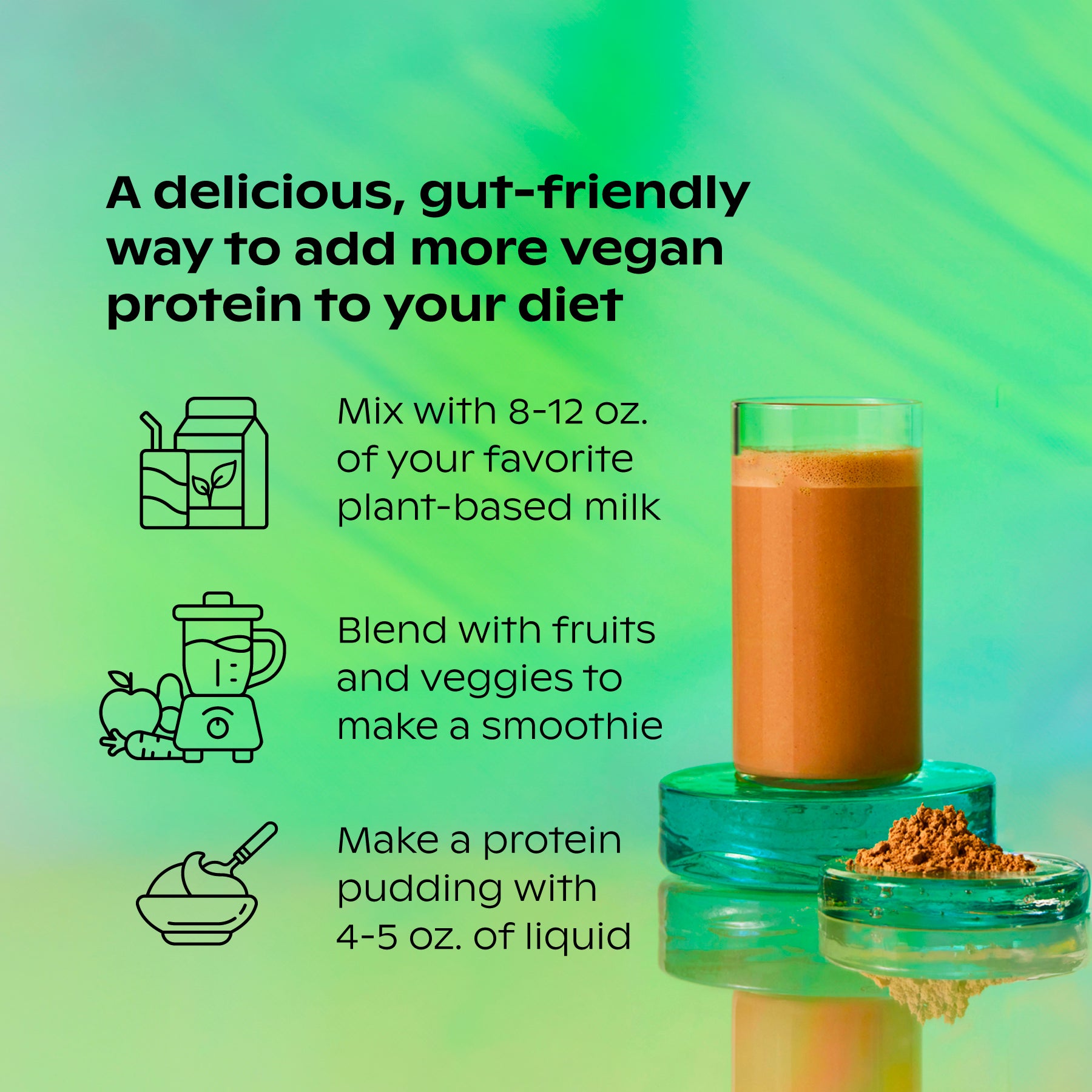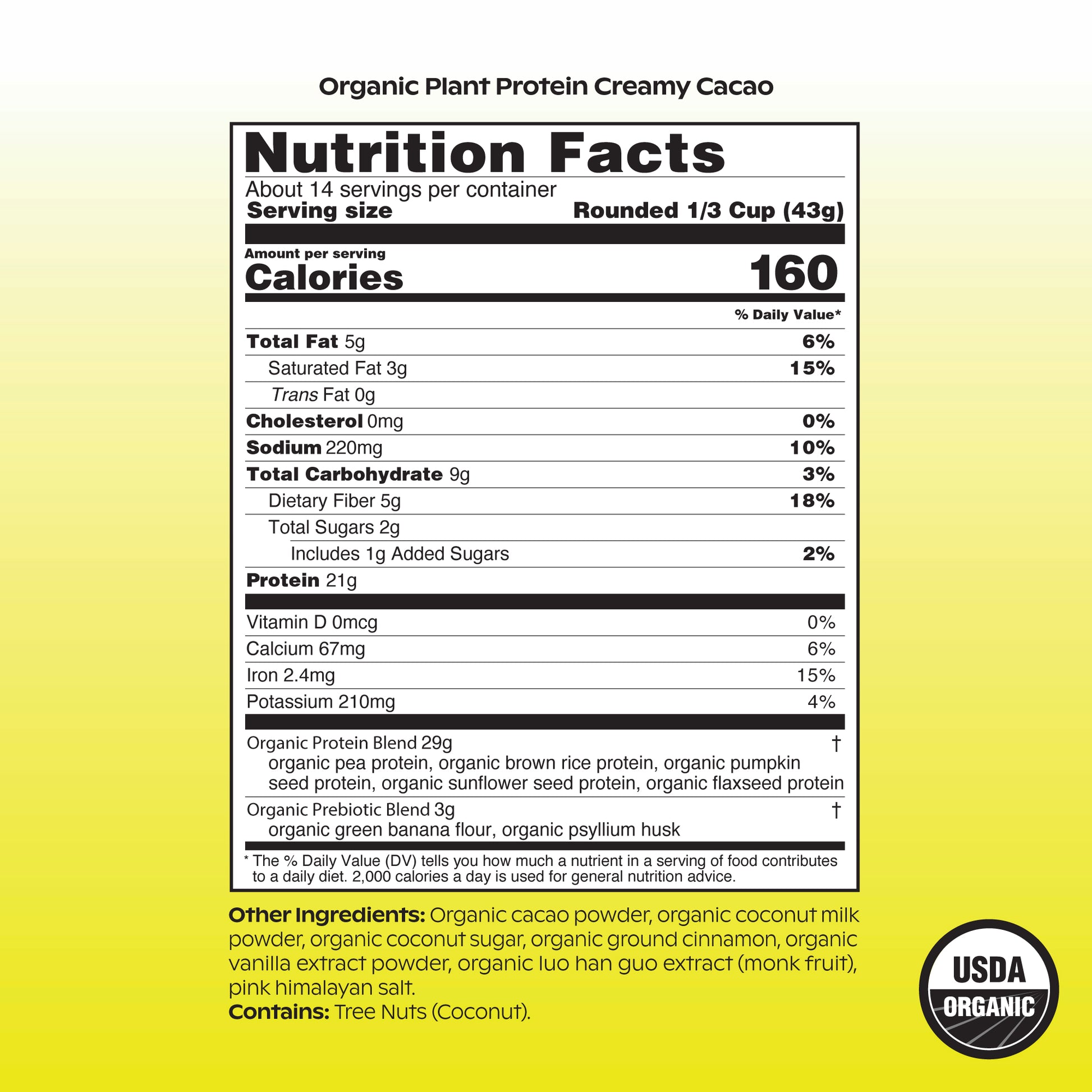 Plant Protein is certified organic, non-GMO, vegan, gluten-free and soy-free. The formulation contains tree nuts (coconut milk).